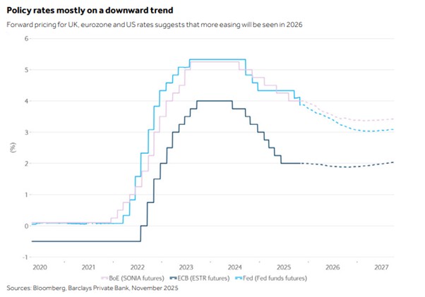Pictet noted we are “Past peak trade uncertainty, Supportive monetary policy, broad-based fiscal stimulus. Going into 2026, the backdrop should be supportive for global growth.”
