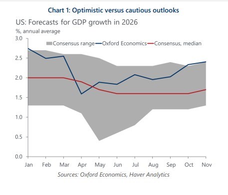 Oxford Economics expects the US economy to “outperform consensus expectation, supported by wealth effects, AI- and non-AI related business equipment spending, and solid productivity growth… the economy will reap the benefits of increased AI spending.”